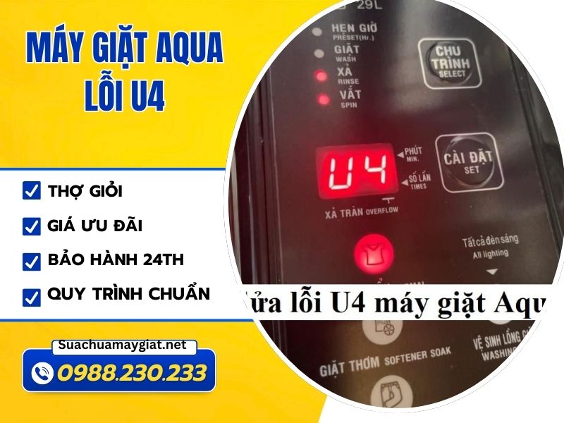 Khi sử dụng máy giặt Aqua, nhiều khách hàng phản ánh gặp tình trạng máy giặt Aqua lỗi U4 khiến thiết bị dừng hoạt động giữa chừng. Trong bài viết dưới đây, Suachuamaygiat.net – ☎️ 0988.230.233 sẽ phân tích chi tiết nguyên nhân máy giặt Aqua lỗi U4, cách xử lý cũng như dịch vụ sửa chữa uy tín mà bạn có thể tin tưởng.