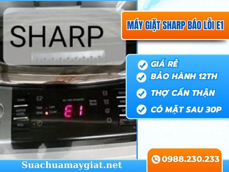 Màn hình hiển thị lỗi E1 máy giặt Sharp hoặc thông báo “máy giặt Sharp báo lỗi E1”.